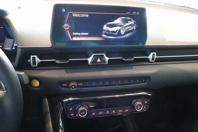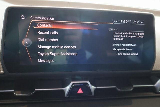 - 8.8-in. Touchscreen with supra commandfeaturing touchpad control with navigation,am/fm, digital audio, siriusxm®,wireless apple carplay®compatible, voice recognitionand usb/. Bluetooth. ®connectivity. See toyota.Com/connected-services/grsupra-support for details.Concentrating on the road should always be your first priority while driving.,Available on select gr supra models. Includes a 4-year trial period. Services require 4g cellular network availability, a cellular connection and gps signal. Without any one or more of these things, operability and availability may be limited or precluded. Service not available in every city or roadway. Use common sense when relying on information provided. Services vary by vehicle and are subject to change at any time without notice. Terms of use apply. Data charges may apply. For service details and limitations, see your navigation system. Owner’s manual. And. Supraconnect.Com. For service details and limitations. For supra connect data collection, use, sharing, and retention practices, please visit. Supraconnect.Com/terms-and-conditions.Html. .,Service will automatically stop at the end of your trial subscription period unless you decide to continue service. Trial is non-transferable. If you do not wish to enjoy your trial, you can cancel by calling the number below. All siriusxm services require a subscription, each sold separately by siriusxm after the trial period. Service subject to the siriusxm customer agreement and privacy policy, visit siriusxm.Com for complete terms and how to cancel which includes online methods or calling 1-866-635-2349. Some services and features are subject to device capabilities and location availability. Satellite service not available in ak & hi. Content varies by siriusxm subscription plan. All fees, content and features are subject to change. Siriusxm and related logos are trademarks of sirius xm radio inc. And its respective subsidiaries.,Available on select gr supra models. Requires compatible iphone® and active data plan. Operability depends on network availability, a cellular connection, and gps signal. Services vary by vehicle and are subject to change at any time without notice. Data charges may apply. See. Owner’s manual. Or. Supraconnect.Com. For service details and limitations. For. Supra connect terms and conditions. And data collection, use, sharing, and retention practices, please visit. Supraconnect.Com/terms-and-conditions.Html. . Apple carplay® and iphone® are registered trademarks of apple inc.,Voice recognition capabilities vary by head unit.,May not be compatible with all mobile phones, smart devices, tablets, e-readers, mp3/wma players and like models.,A compatible. Bluetooth. ®-enabled phone must first be paired. Phone performance depends on software, coverage and carrier. The. Bluetooth. ® word mark and logos are registered trademarks of bluetooth sig, inc. Use of such marks by toyota is under license.