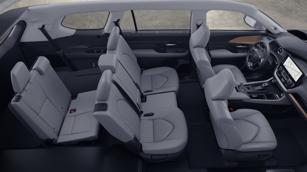 - 7-passenger seating with second-row fold-down captain's chairs and fold-down inboard armrests, adjustable headrests and two cup holders mounted on the floor; and 60/40 split, fold-down third-row seats with sliding headrests and recline function.