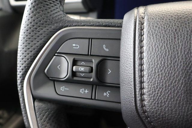 - Leather-trimmed manual tilt/telescopic steering wheel with phone, audio, display/infotainment, and driver assist controls.