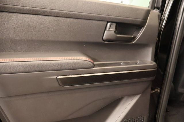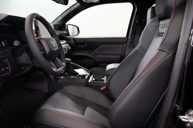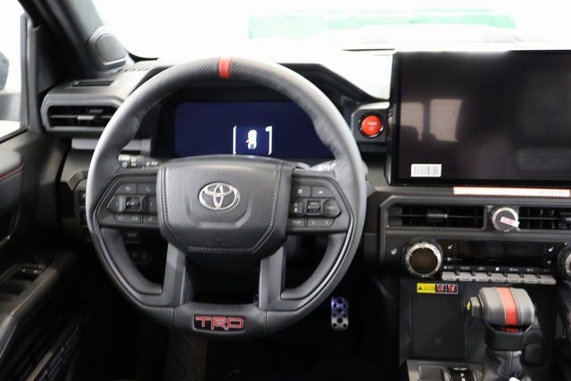 - Trd pro leather-trimmed manual tilt/telescopic steering wheel with trd badge, red center stripe, and phone, audio, display/infotainment, and driver assist controls.