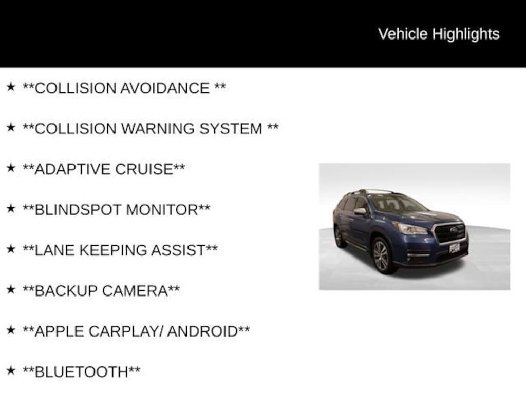 We Buy cars- Fast, Fair and Easy This 2020 Abyss Blue Pearl Subaru Ascent Touring AWD is well equipped and includes these features and benefits: Popular Package #3 (Aero Crossbar Set, All-Weather Floor Liners, Auto-Dimming Exterior Mirror w/Approach Light, Cargo Tray, Rear Bumper Cover, and Rear Seatback Protector), Standard Model, 14 Speakers, 3rd row seats: bench, 3rd Row Sunshade, 4-Wheel Disc Brakes, ABS brakes, Abyss Blue Pearl Body Side Molding, Abyss Blue Pearl Door Edge Guards, Air Conditioning, Alloy wheels, AM/FM radio: SiriusXM, Auto High-beam Headlights, Auto-dimming Rear-View mirror, Automatic temperature control, Axle Ratio: 4.44, Brake assist, Bumpers: body-color, CD player, Compass, Delay-off headlights, Door Scuff Protector, Driver door bin, Driver vanity mirror, Dual front impact airbags, Dual front side impact airbags, Electronic Stability Control, Emergency communication system: STARLINK Safety and Security (Subscription Required), Exterior Parking Camera Rear, Four wheel independent suspension, Front anti-roll bar, Front Bucket Seats, Front Center Armrest, Front dual zone A/C, Front fog lights, Front reading lights, Fully automatic headlights, Garage door transmitter: HomeLink, harman/kardon® Speakers, Heated & Ventilated Front Bucket Seats, Heated door mirrors, Heated front seats, Heated rear seats, Heated steering wheel, Illuminated entry, Knee airbag, Low tire pressure warning, Map & Reading Lights LED Upgrade - 6 Bulb Kit, Memory seat, Navigation System, Occupant sensing airbag, Outside temperature display, Overhead airbag, Overhead console, Panic alarm, Passenger door bin, Passenger vanity mirror, Perforated Leather-Trimmed Upholstery, Power door mirrors, Power driver seat, Power Liftgate, Power moonroof, Power passenger seat, Power steering, Power windows, Radio data system, Radio: Subaru STARLINK 8.0 Multimedia Nav System, Rain sensing wipers, Rear air conditioning, Rear anti-roll bar, Rear reading lights, Rear window defroster, Rear window wiper, Reclining 3rd row seat, Remote keyless entry, Security system, Side Sill Plate, Speed control, Splash Guards, Split folding rear seat, Spoiler, STARLINK/Apple CarPlay/Android Auto, Steering wheel mounted audio controls, Tachometer, Telescoping steering wheel, Tilt steering wheel, Traction control, Trailer Hitch, Trip computer, Turn signal indicator mirrors, Variably intermittent wipers, Ventilated front seats, Wheels: 20 Dk Gray Aluminum Alloy w/Machine Finish, and Windshield Sunshade.