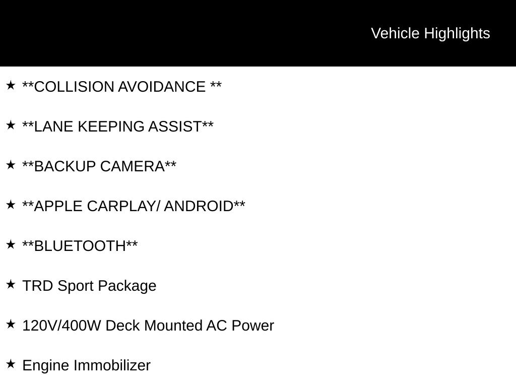 Step inside the well-appointed cabin and you'll be greeted by a host of premium amenities, including a 120V/400W Deck Mounted AC Power, a power driver's seat, and a state-of-the-art infotainment system with Apple CarPlay and Android Auto integration. The Tacoma also boasts a comprehensive suite of advanced safety features, including Automatic High-Beam Headlights, Rear Camera, and a Safety Connect emergency communication system.