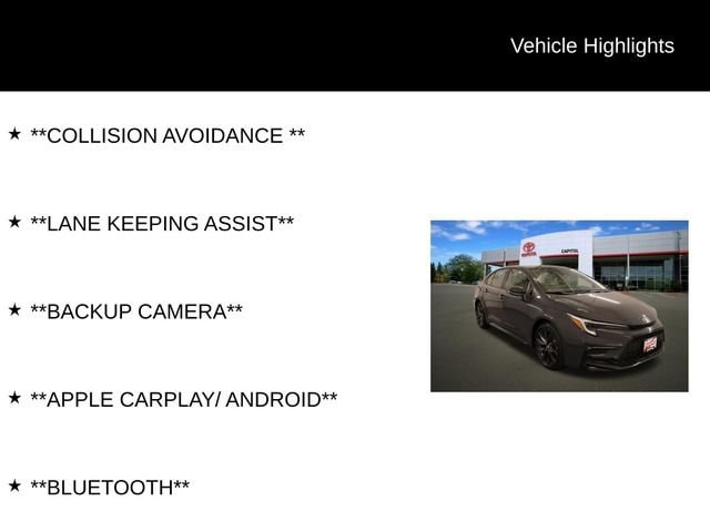 The 1.8L DOHC 16V VVT engine, paired with the seamless CVT and AWD system, delivers an exceptional blend of power and efficiency. With an EPA-estimated 47 MPG in the city and 41 MPG on the highway, this Corolla Hybrid SE offers impressive fuel savings, making it an economical choice for your daily commute or weekend adventures.